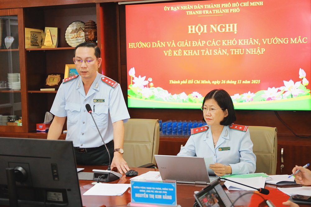 Ngày 26 tháng 11 năm 2025, Thanh tra Thành phố Hồ Chí Minh đã tổ chức Hội nghị hướng dẫn và giải đáp các khó khăn, vướng mắc trong công tác kê khai tài sản, thu nhập cho khối Ủy ban nhân dân các phường, xã, đặc khu trên địa bàn Thành phố Hồ Chí Minh. Hội nghị được tổ chức theo hình thức trực tuyến tại trụ sở Thanh tra Thành phố Hồ Chí Minh đến 168 điểm cầu tại trụ sở Ủy ban nhân dân các phường, xã, đặc khu.