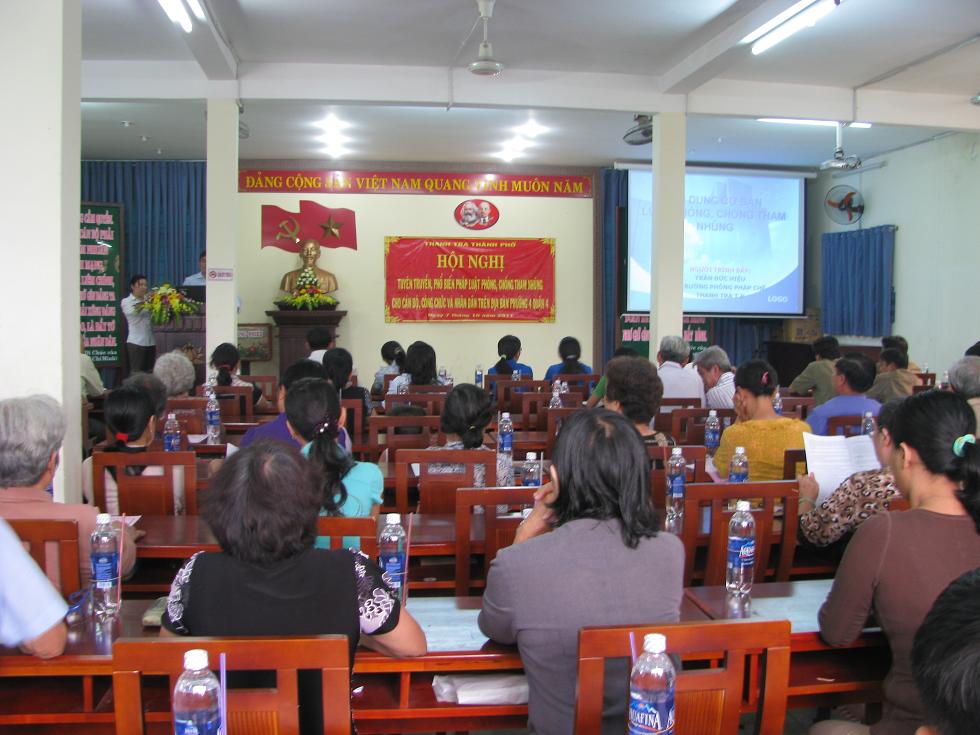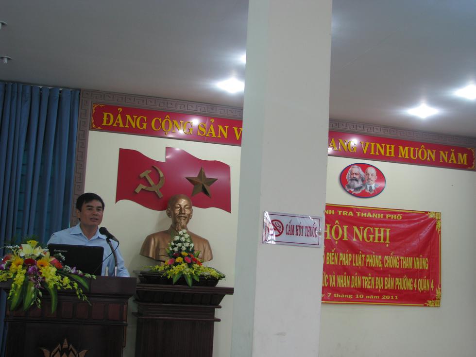Sáng 7/10/2011, tại Trụ sở UBND phường 4 quận 4, Thanh tra thành phố ( TTTP ) tổ chức lớp tuyên truyền, phổ biến pháp luật về phòng, chống tham nhũng ( PCTN ) cho cán bộ, công chức và nhân dân trên địa bàn phường 4 quận 4, tới dự có ông Trần Đức Hiệu, Thanh tra viên chính - Phó Trưởng phòng Pháp chế TTTP, lãnh đạo Thanh tra quận 4, lãnh đạo Đảng ủy, UBND phường, đại diện các ban ngành đoàn thể và đông đảo nhân dân trong phường.