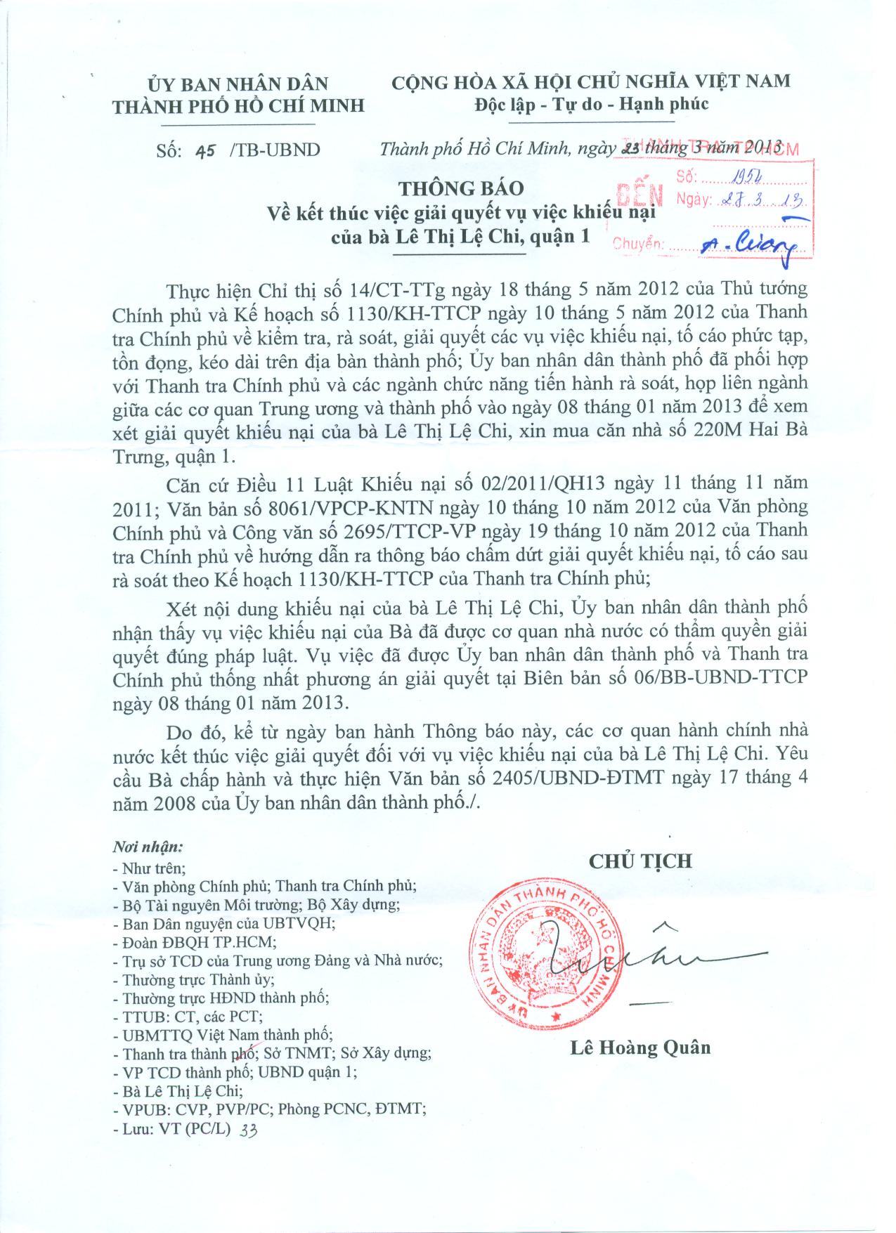 Kế từ ngày 23 tháng 3 năm 2013, các cơ quan hành chính nhà nước thuộc Ủy ban nhân dân thành phố chấm dứt thụ lý giải quyết vụ việc khiếu nại của Bà Lê Thị Lệ Chi, quận 1.