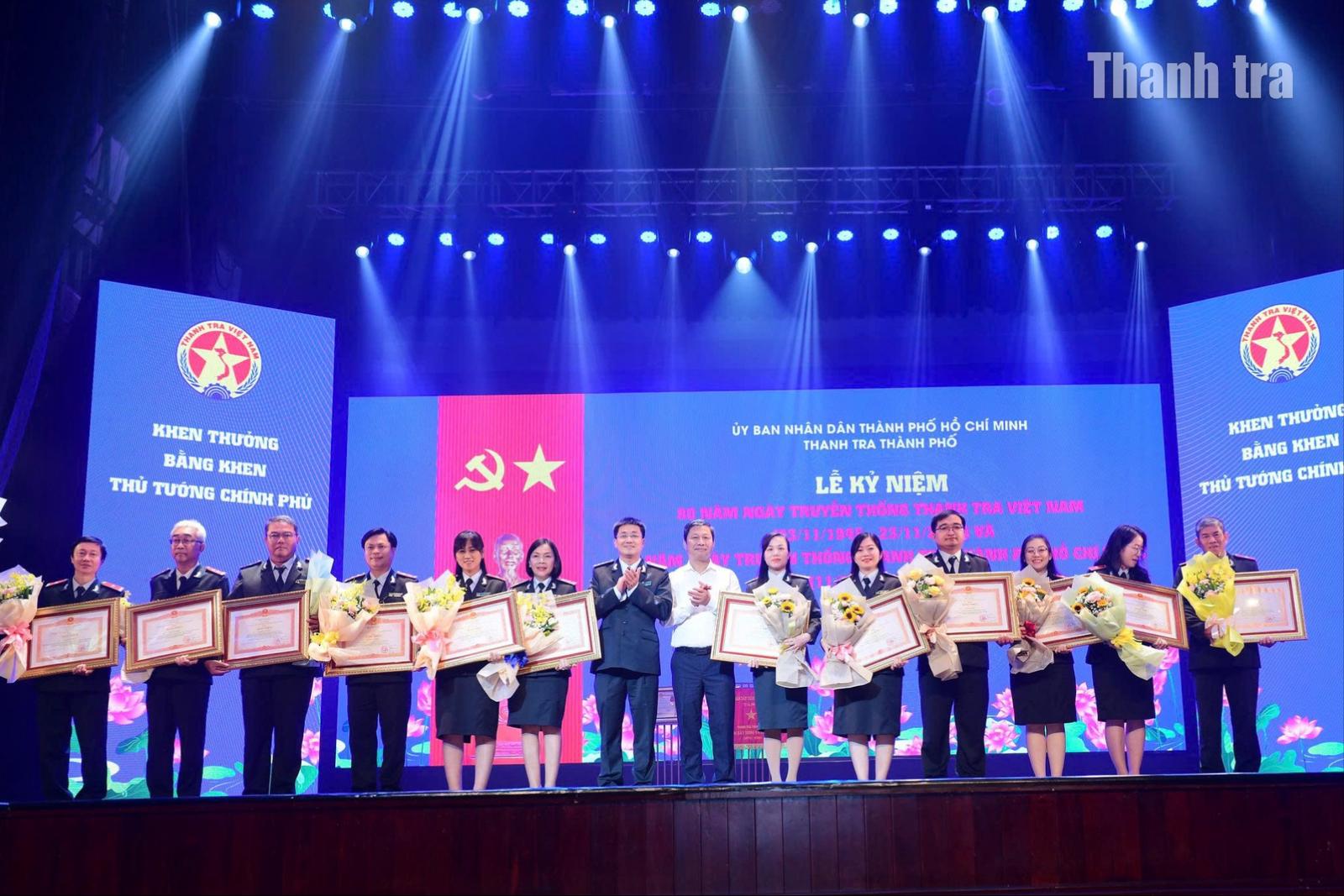 Thừa ủy quyền, ông Đào Trung Kiên, Cục trưởng Cục III (Thanh tra Chính phủ) và ông Phạm Văn Nghì, Phó Chánh Thanh tra TP Hồ Chí Minh tặng Bằng khen của Thủ tướng Chính phủ cho các cá nhân. Ảnh: Nhật Huyền